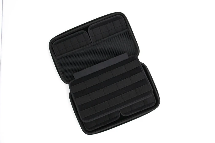 Inside the 11″ X 6.5″ carbon fiber stylized case, you’ll find a system of velcro flex panels you can use to store your items securely.